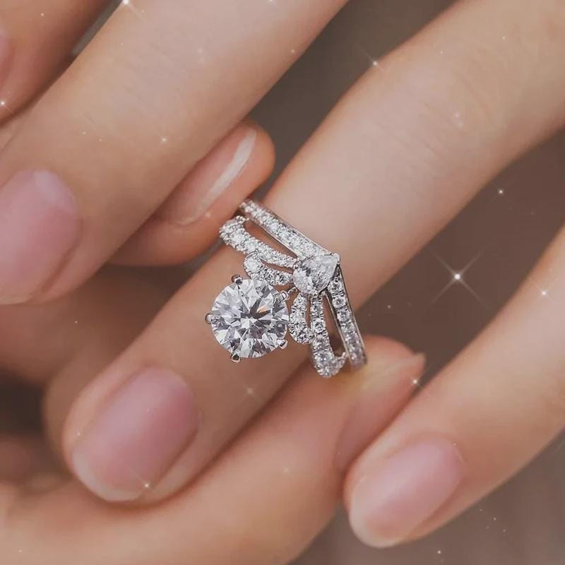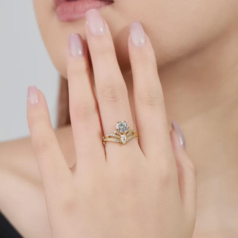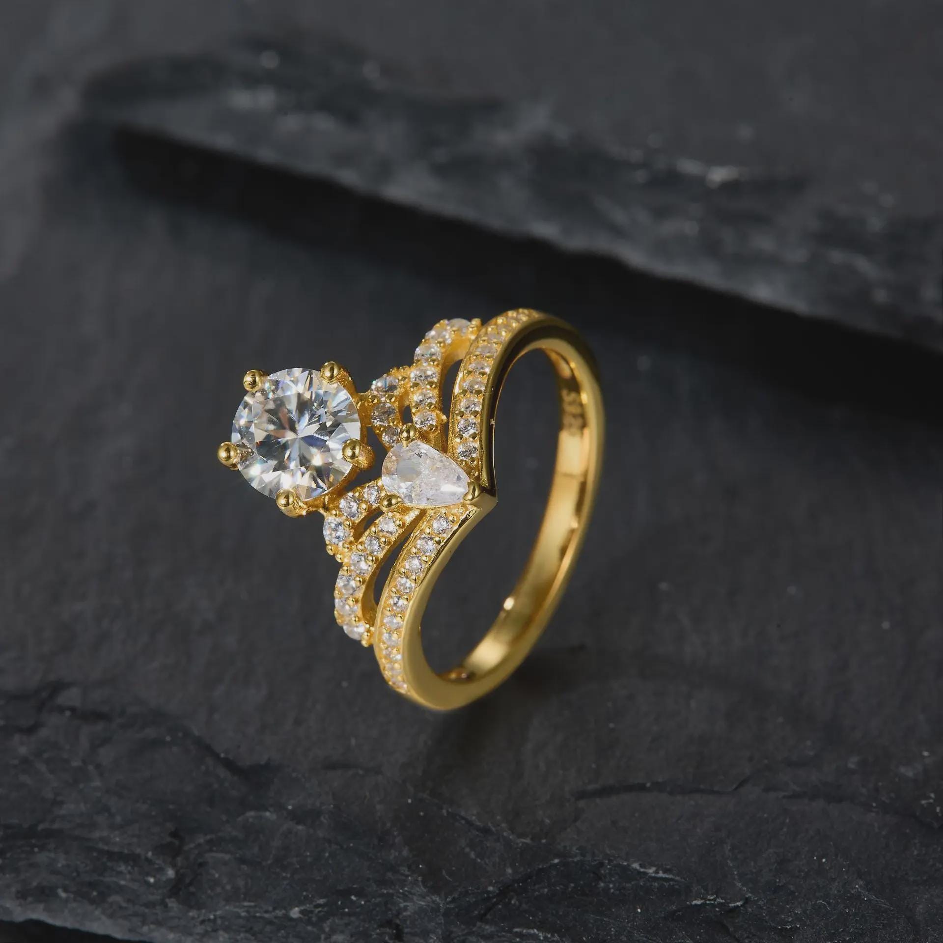 Radiate Sophistication with Opulence Aura’s Handcrafted Regal Crown Moissanite Engagement Ring Set, Sterling Silver V-Shaped Wedding Band, Round Cut Bridal Ring, Anniversary Gift for Her.